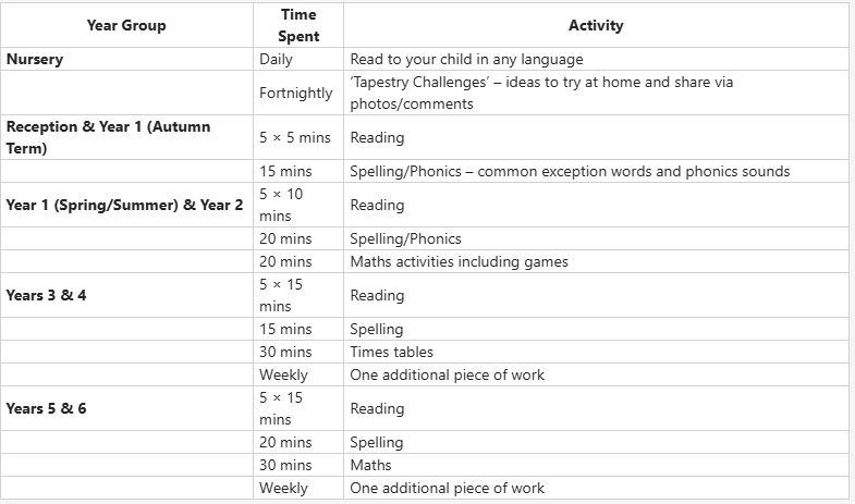 In addition to the creative tasks, we have clear expectations for English and Maths home learning across the school. Please see the table below for guidance: