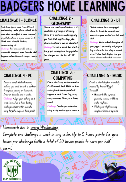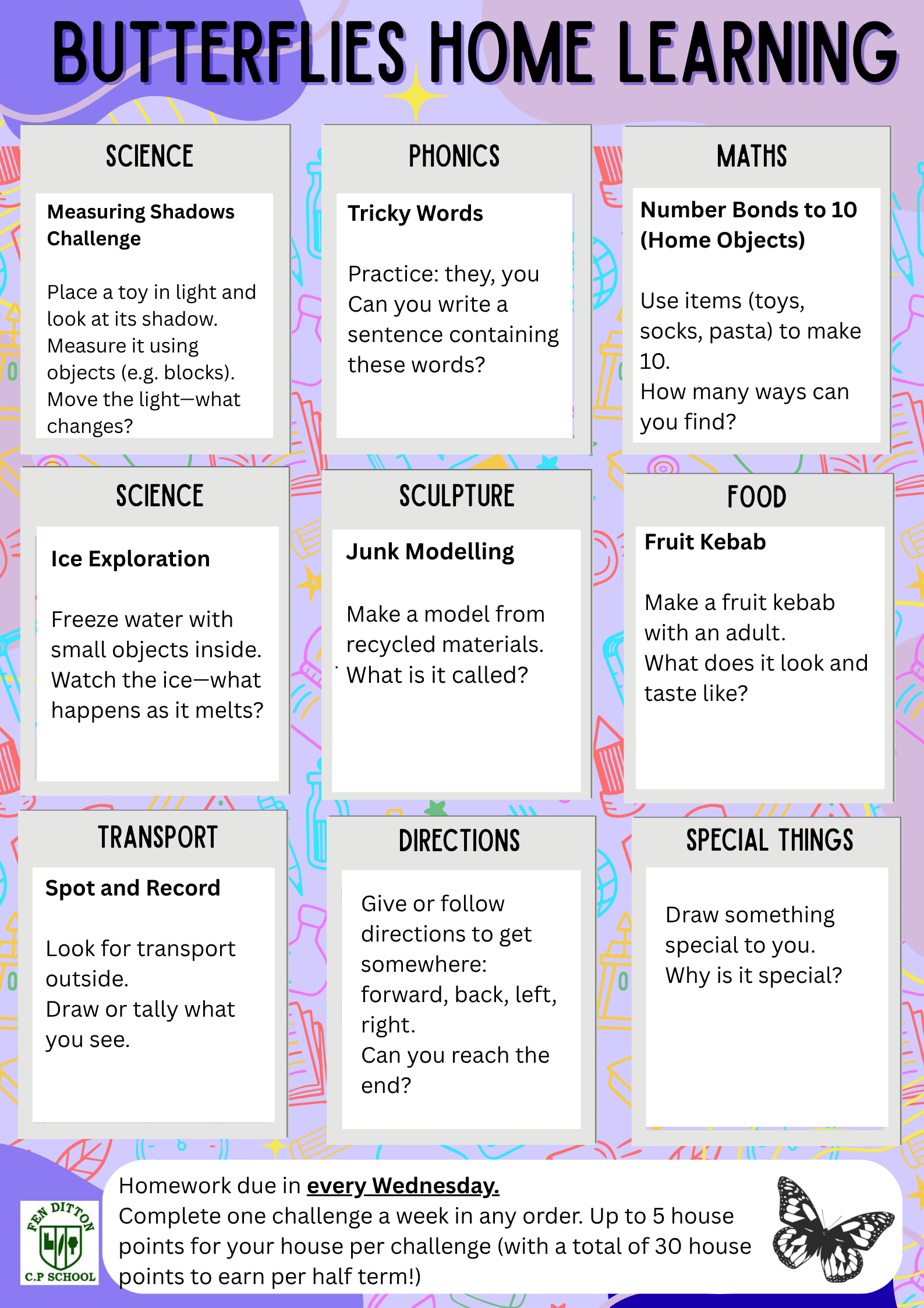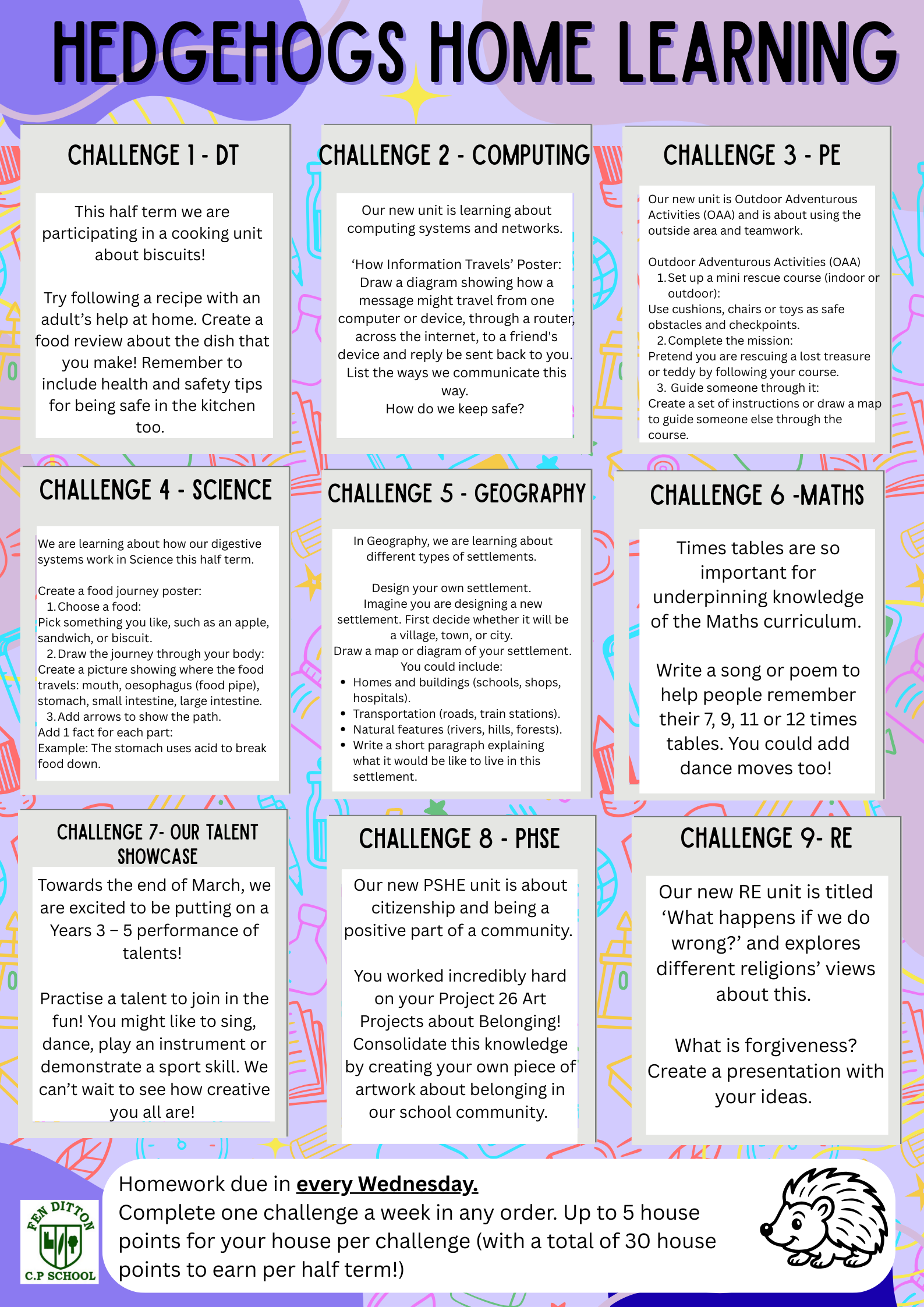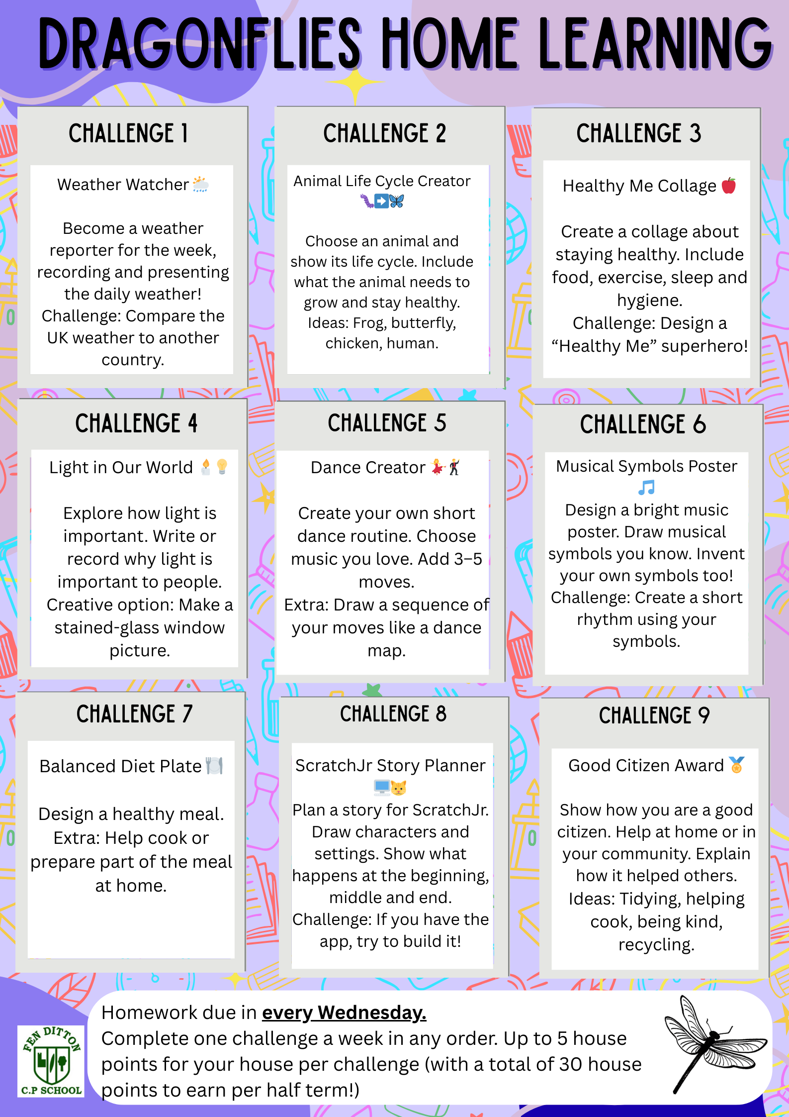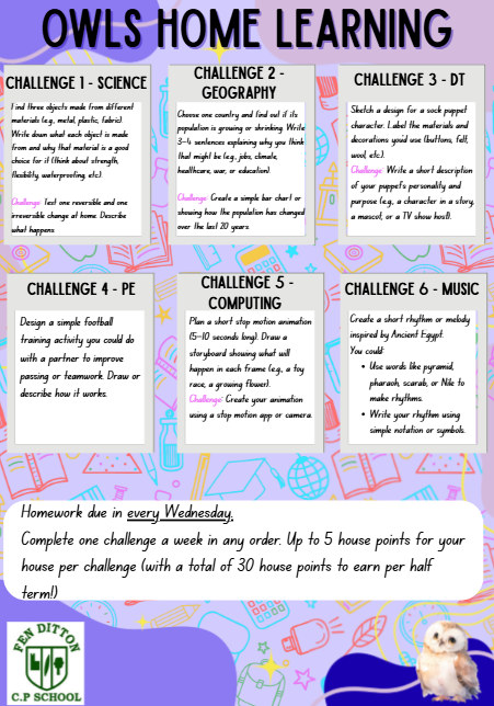 Each half term, children will receive a Home Learning Menu – a selection of open-ended tasks linked to their current learning in school. These tasks are designed to be flexible and creative, allowing children to respond in a way that suits their interests and strengths. They may choose to create models, write stories, produce artwork, or carry out research – the possibilities are wide-ranging and purposeful.