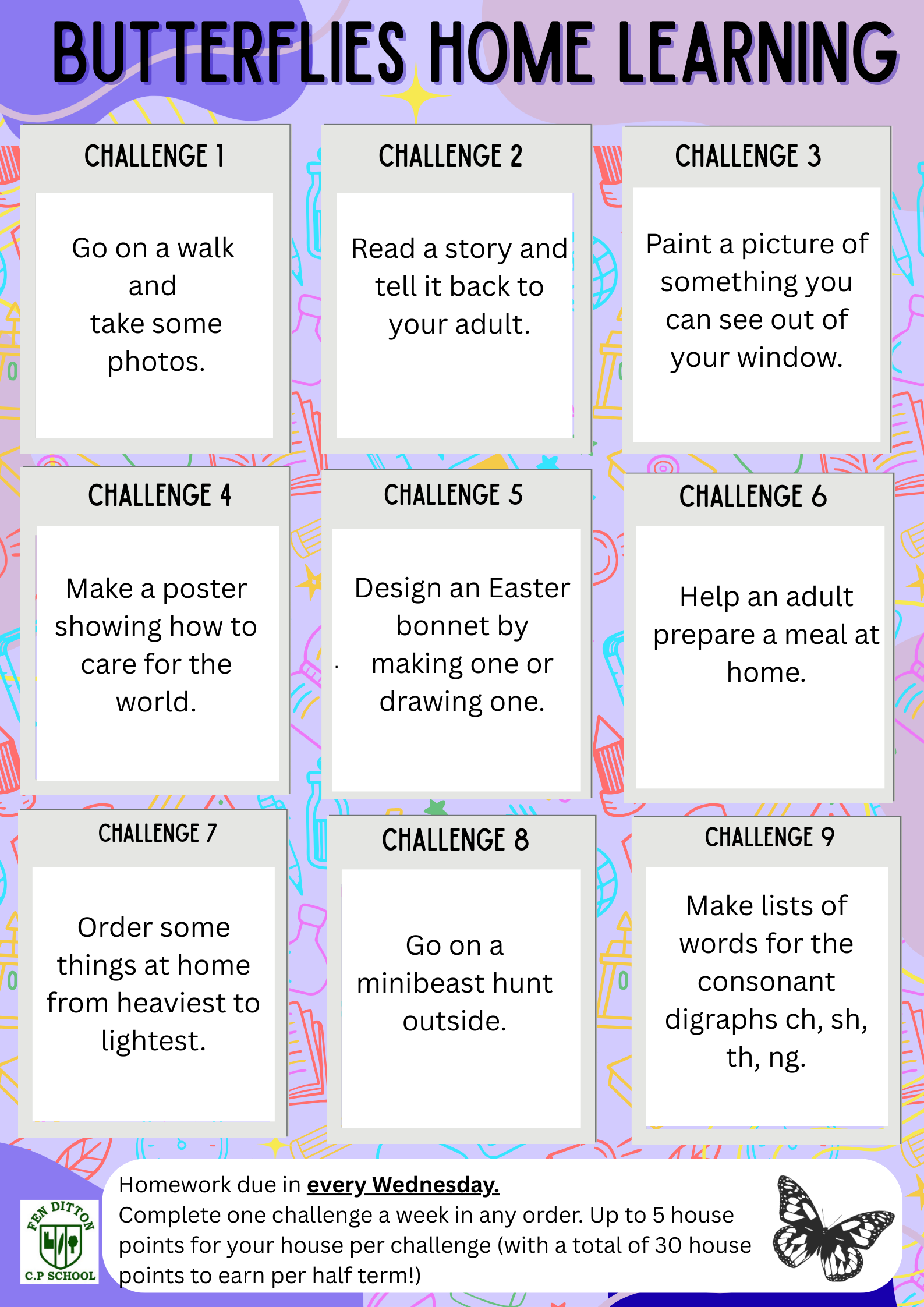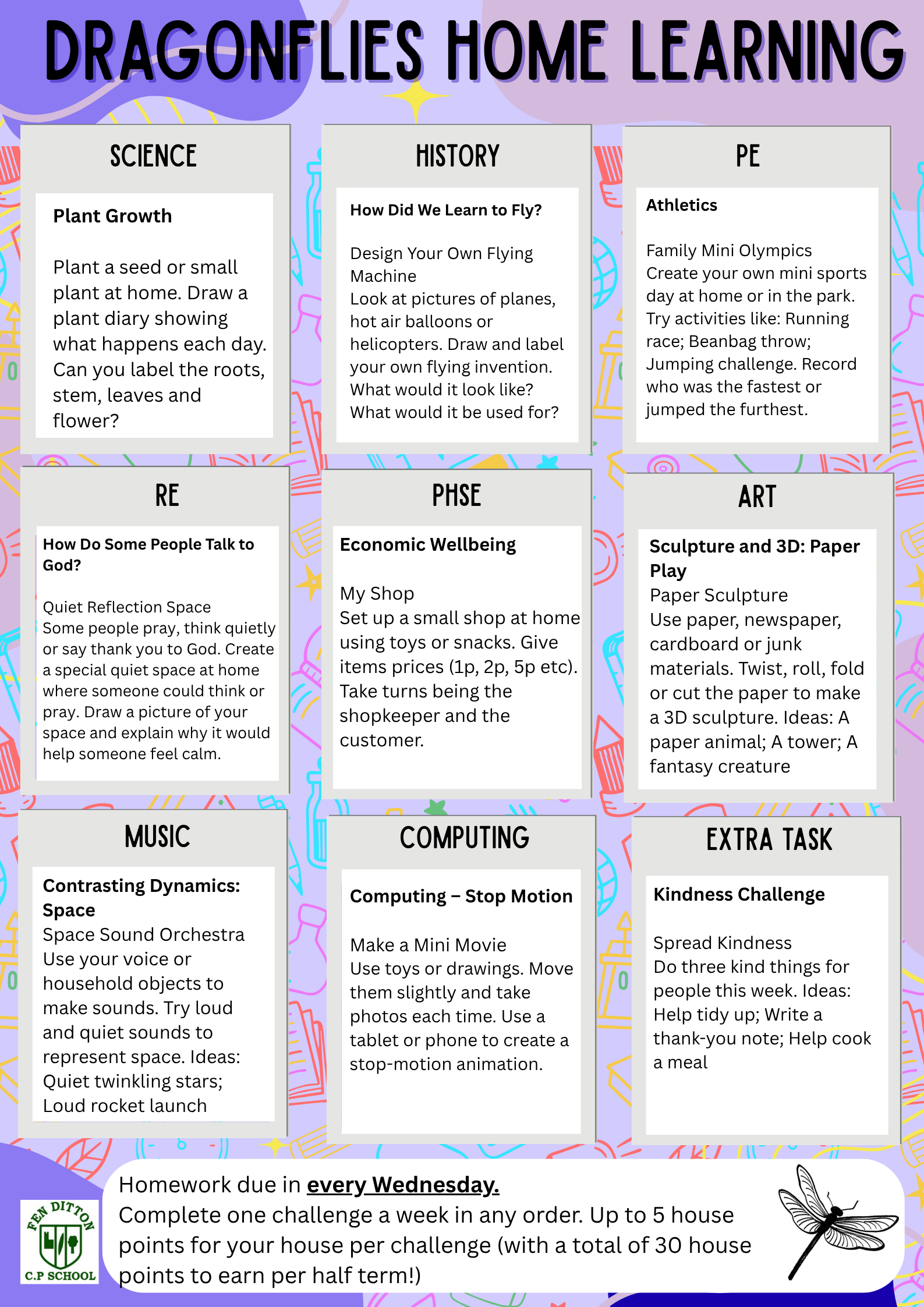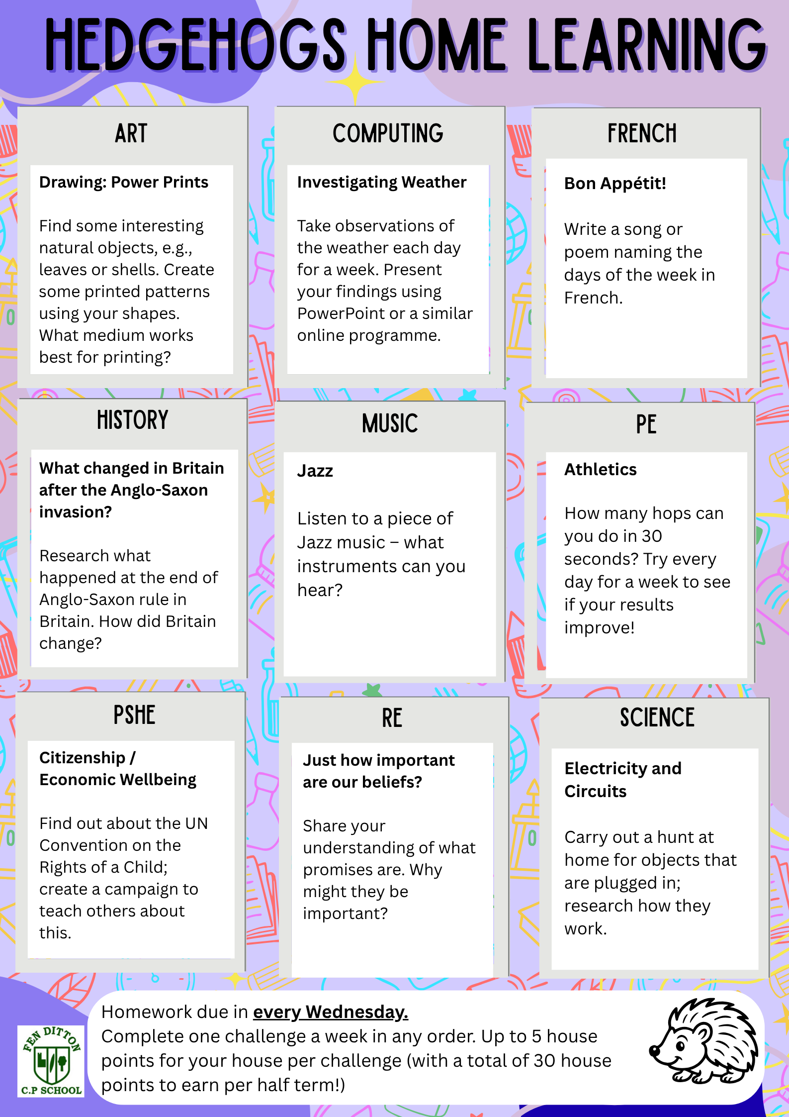 In addition to the creative tasks, we have clear expectations for English and Maths home learning across the school. Please see the table below for guidance: